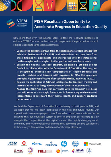 Now more than ever, the Alliance urges to take the following measures to enhance STEM Education in the country in response to the poor performance of Filipino students to large scale assessments: